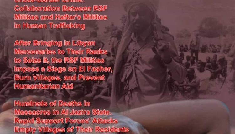 The RSF continues to commit atrocities in the capital and other states, targeting safe villages and subjecting their residents, particularly women and children, to horrors and violations, including the killing of innocents. Recent local and international official reports, documented by the magazine “Al-Hakika,” specializing in monitoring and documenting RSF violations, in its 15th issue, revealed the RSF’s collaboration with Haftar militias in the most severe transnational human crimes, including internationally banned human trafficking. The reports also include statistics on cases of rape, kidnapping, and enslavement of women and girls. The RSF committed massacres against more than 140 people in a single village in Al-Jazirah State, and “Al-Hakika” documented international reports of village burnings in El Fasher, obstruction of humanitarian aid, and bringing in mercenaries from Libya to seize El Fasher, promising them loot in return. The RSF also used children in warfare, taking them hostage to demand ransom in clear violation of international laws and norms.