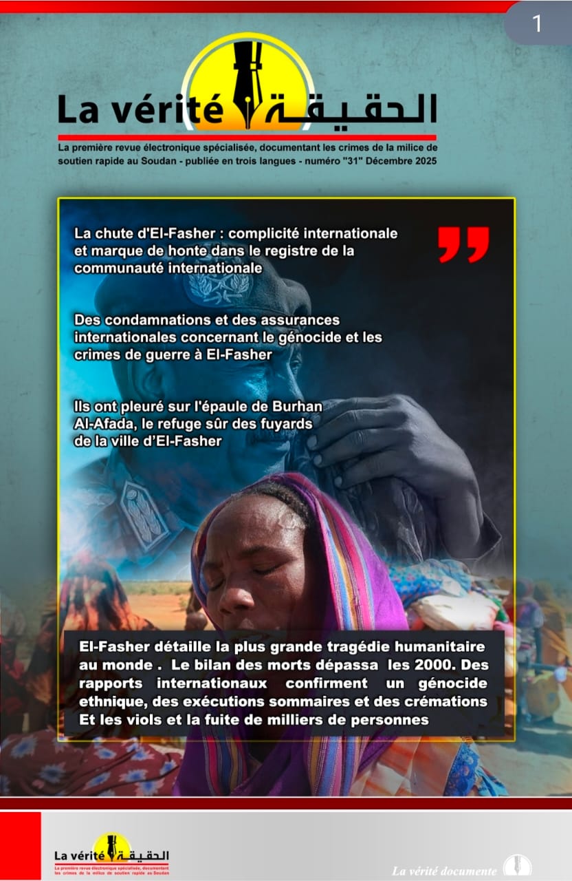 The United Nations, international mechanisms, and several countries condemned the atrocities committed against civilians in El Fasher, North Darfur, and Bara, North Kordofan. The 31st issue of Al-Hakika (The Truth) sheds light on the tragedy in El Fasher, North Darfur, and the atrocities in Bara, North Kordofan, in a special report supported by figures, statistics, international and local reports and investigations, and testimonies from victims and witnesses.