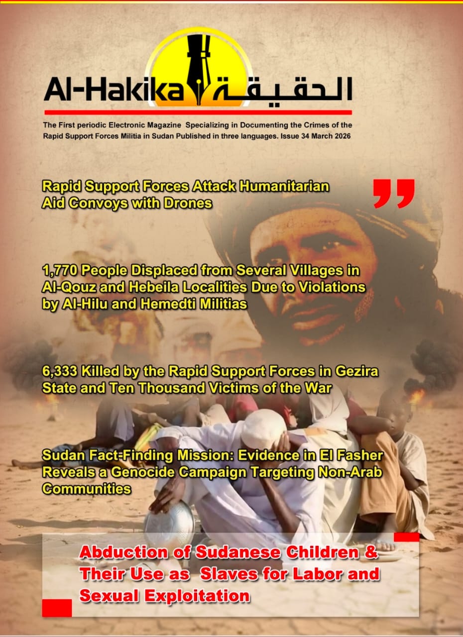 Issue (34) of Al-Hakika online magazine has been released, featuring an extensive report documenting the most serious violations committed by the Rapid Support Forces (RSF) militia across several Sudanese states. The issue relies on international reports, official statistics, and documented testimonies.